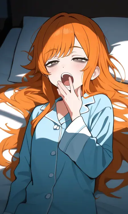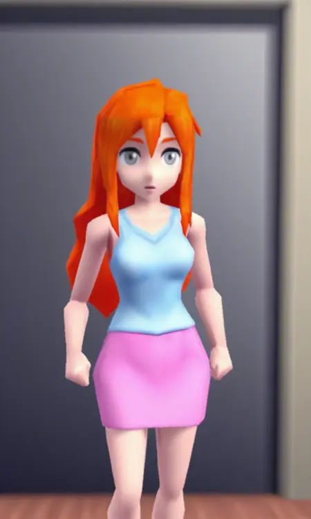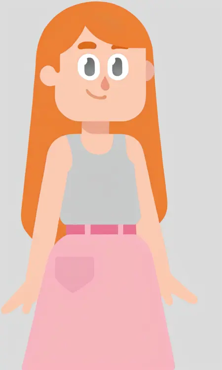 1girl,long hair,orange hair,grey eyes,light blue tank top,sleeveless,pink skirt