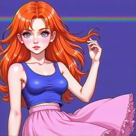 1girl,long hair,orange hair,grey eyes,blue tank top,sleeveless,pink skirt