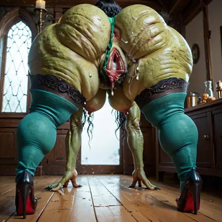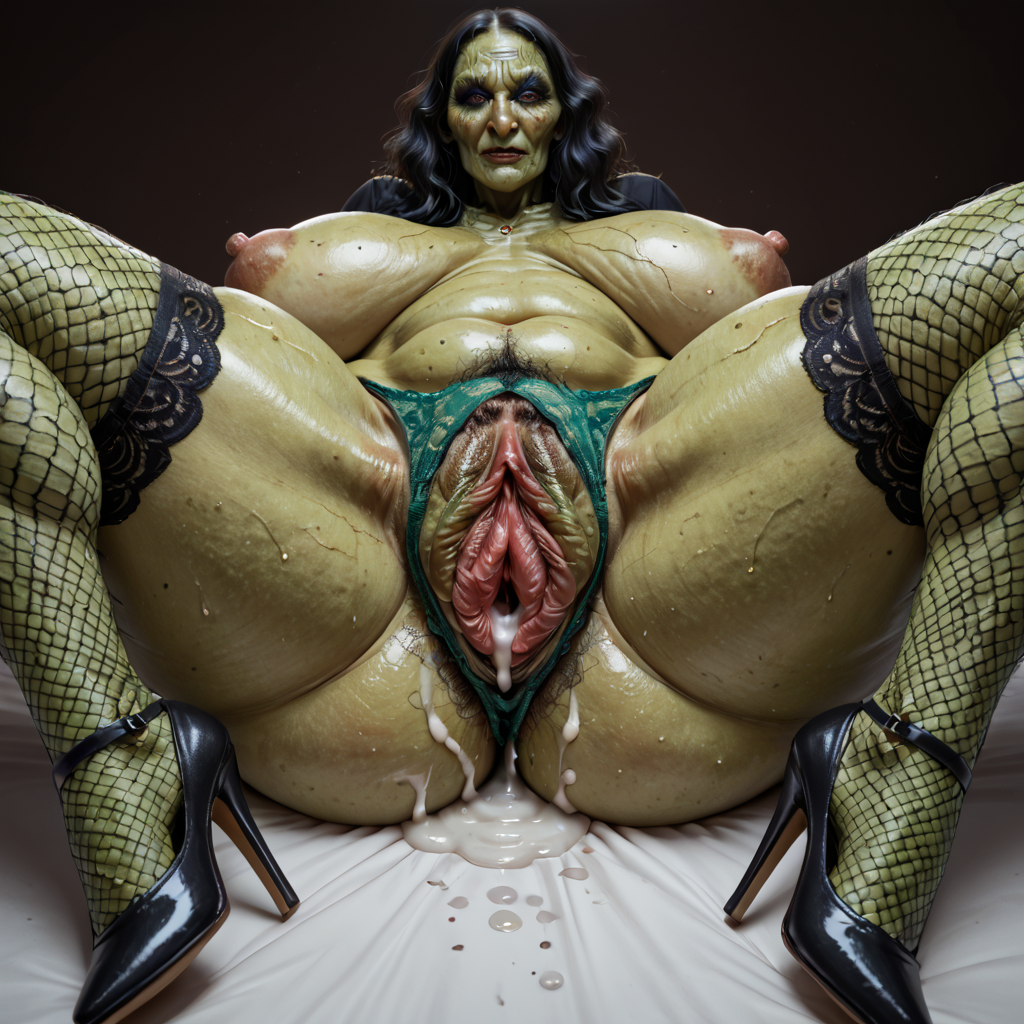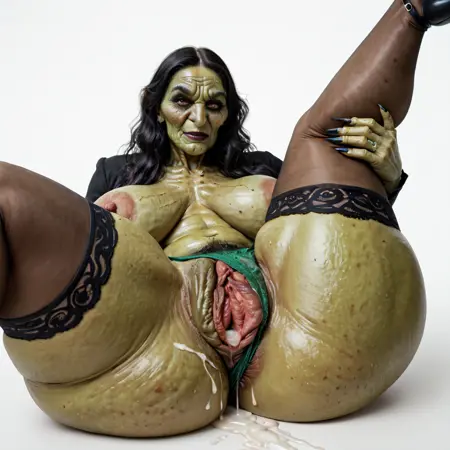 witchag, red eyes, veins, thick thighs, green skin, (wrinkle skin:1.35)
