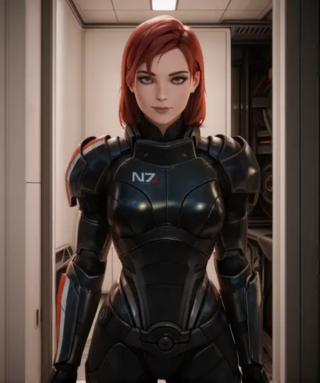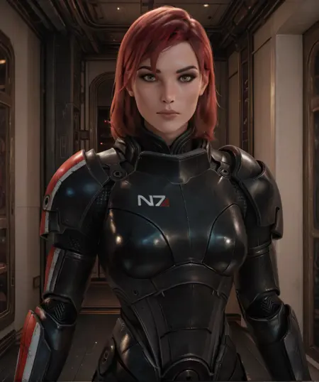 was trained in her black dress, red trim, necklace, sleeveless, but suggest armor, in NEG
