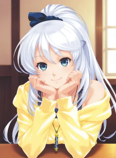 Yuki Hiiragi, ponytail, hair bow, pendant, yellow hoodie, blue skirt,