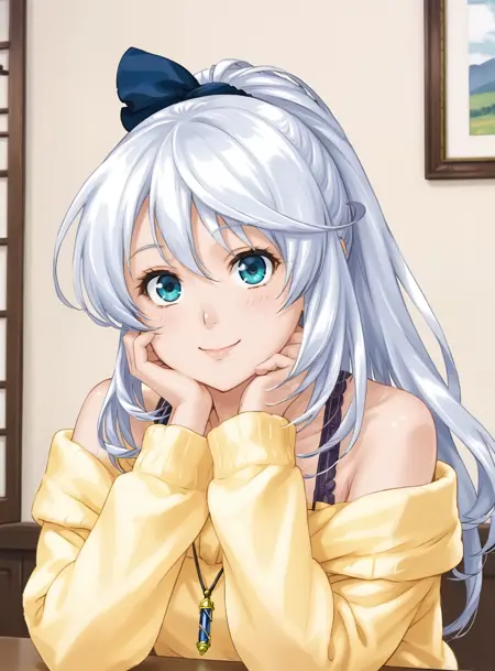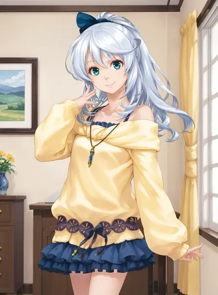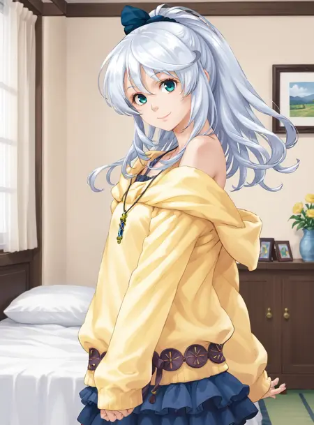 Yuki Hiiragi, 马尾, 发带, 吊坠, 黄色连帽衫, 蓝色裙子,