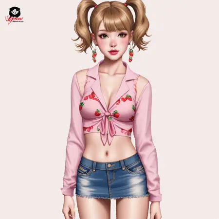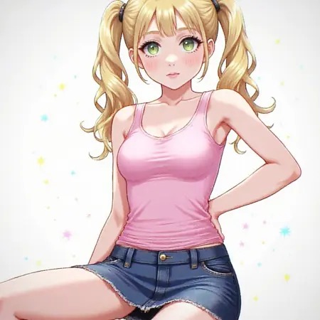 1girl,twintails,blonde hair,green eyes,pink tank top,denim skirt