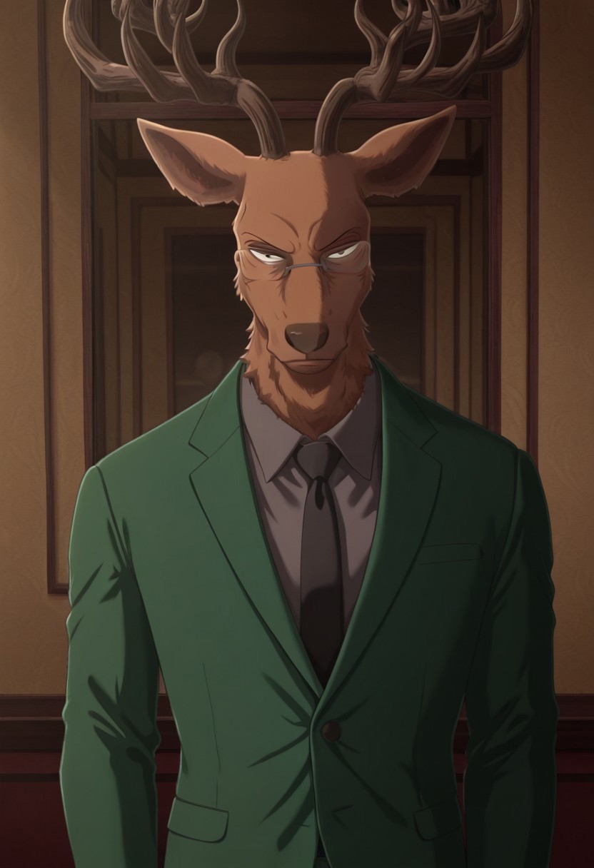 Oguma, 1boy, mature male, anthro, deer, reddish brown body, black eyes, beastars, antlers, animal ears, broad shoulders, athletic build, glasses