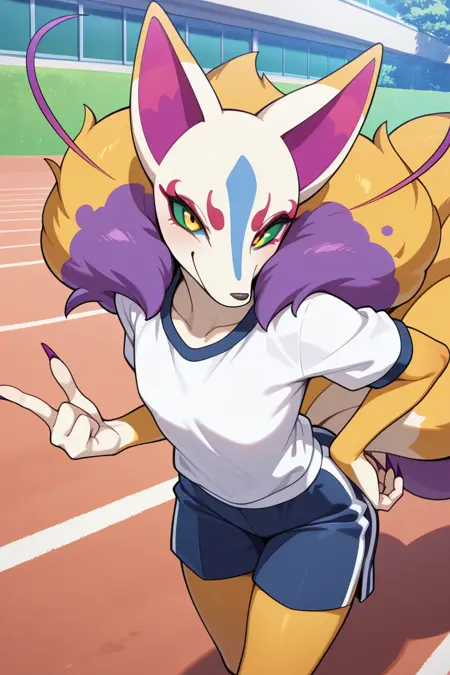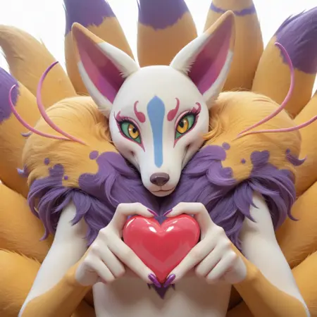 タグ: kyub1, anthro, furry, 黄色い毛皮, 白い毛皮, 紫色の毛皮, 多色の毛皮, 九尾, 複数の尾, 狐の尾, 長い爪, 黄色い目, 色付きの鞄膜, 緑色の鞄膜, 爪