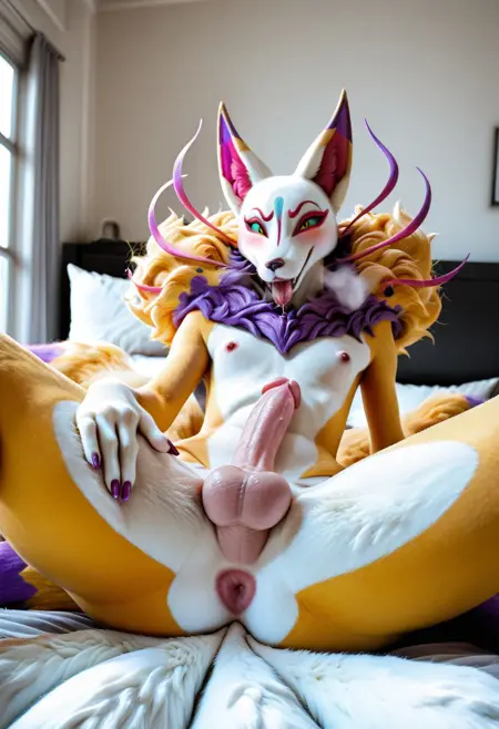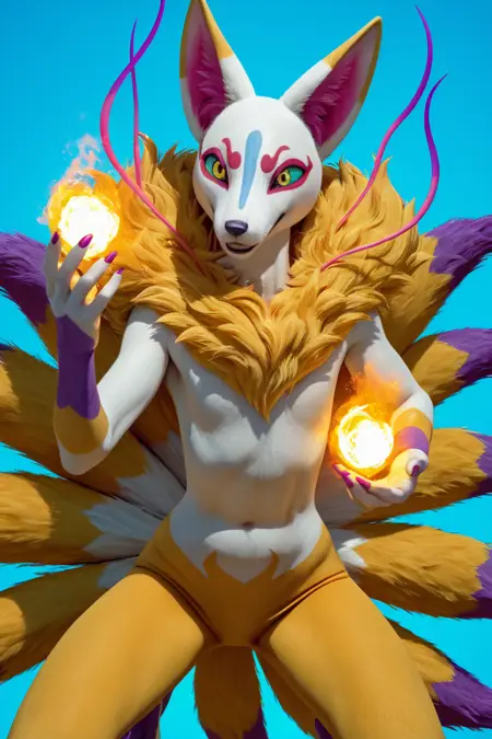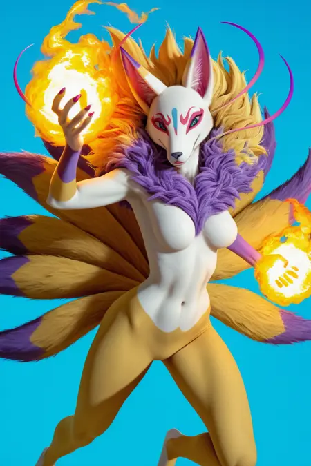 标签: kyub1, 人形, 獸迷, 黄色毛发, 白色毛发, 紫色毛发, 多色毛发, 多条尾巴, 狐尾, 长指甲, 黄色眼睛, 彩色巩膜, 绿色巩膜, 爪子