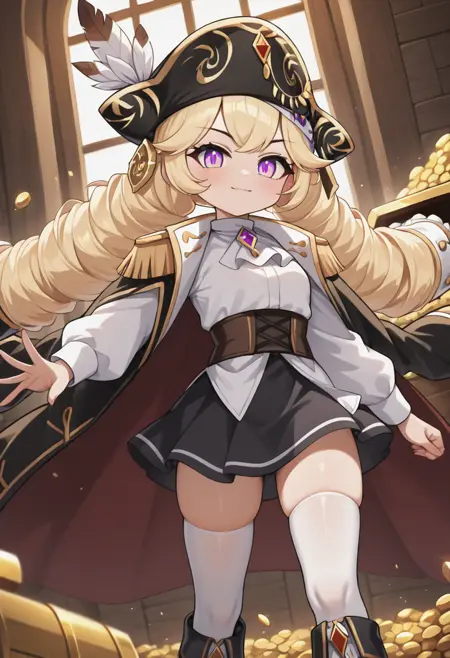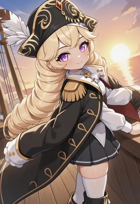 captain_new,1girl,solo,long hair,twintails,twin drills,blonde hair,bangs,purple eyes,white shirt,pirate hat,hat feather,black skirt,boots,white thighhighs,black coat,epaulettes,long sleeves,antique firearm,gun,holding gun,