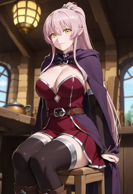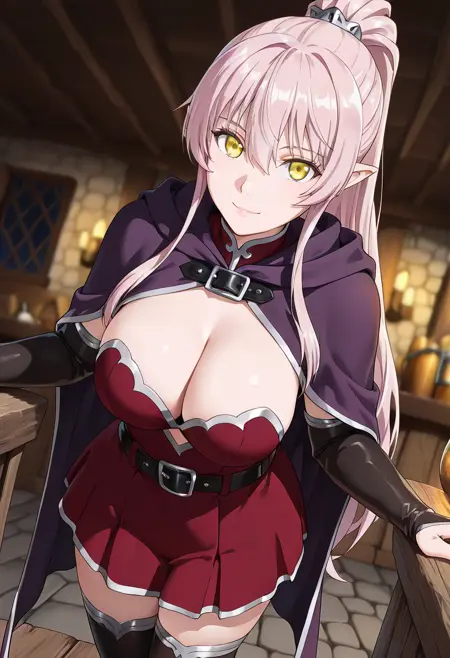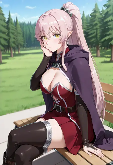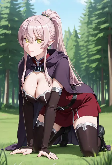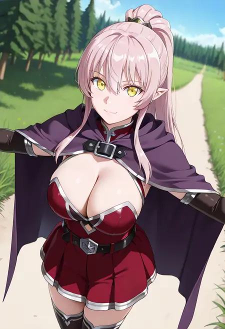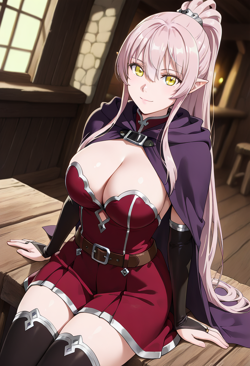 (long_hair, hair_between_eyes, very_long_hair, yellow_eyes, pink_hair, ponytail, sidelocks, pointy_ears:1.2),