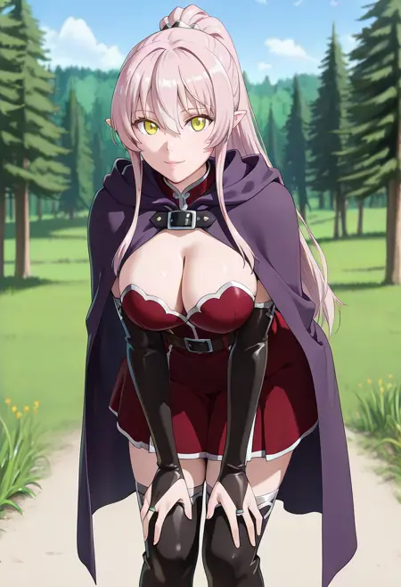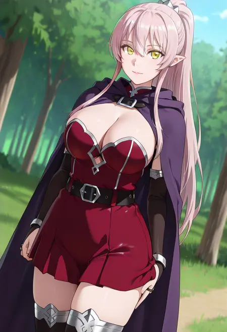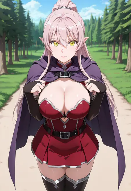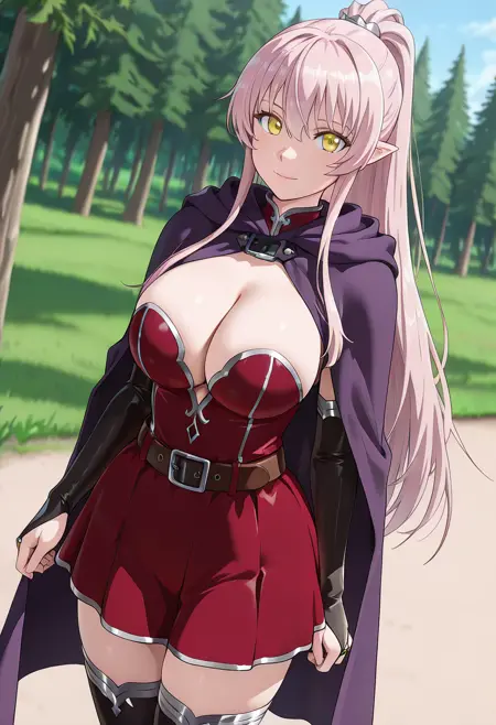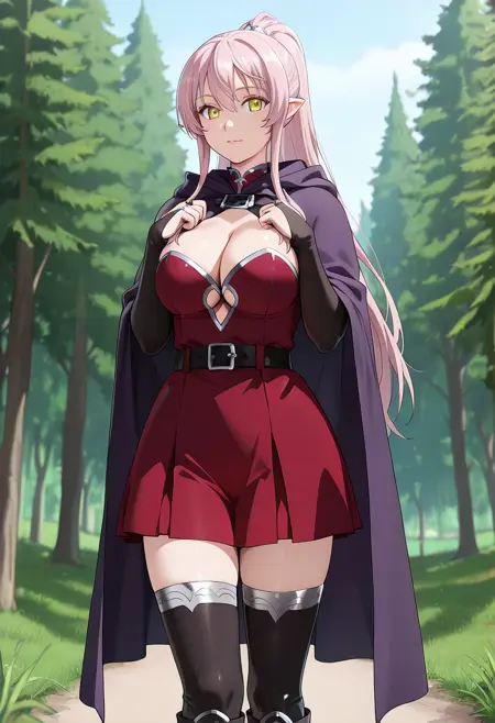 (dress,red skirt, thighhighs_silver_trim, elbow_gloves, bridal_gauntlets, clothing_cutout, cleavage_cutout,zettai_ryouiki,belt, cape, cloak:1.3), boots,