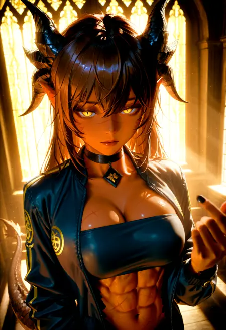 scales, facial mark, pointy ears, dark skin, dark-skinned female, dragon girl, monster girl, dragon horns, yellow eyes, slit pupils, brown hair, large breasts, (thick thighs:1.2), wide hips, muscular, scar, abs, tail,
