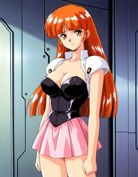 Chiho(Night_Slave), orange hair, long hair, large breasts, blunt bangs,hime cut, orange eyes, cleavage, 1990s (style),orange eyes, cleavage, 1990s (style),
