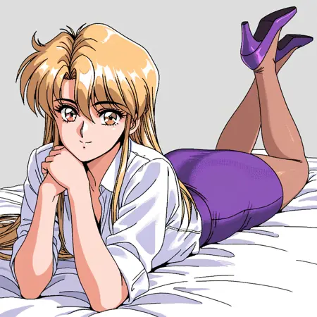裙子、丝袜、铅笔裙、衬衫、高跟鞋、紫色裙子、白色衬衫、袖子卷起、紫色鞋履