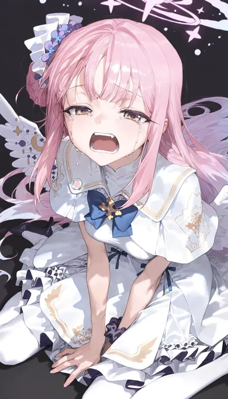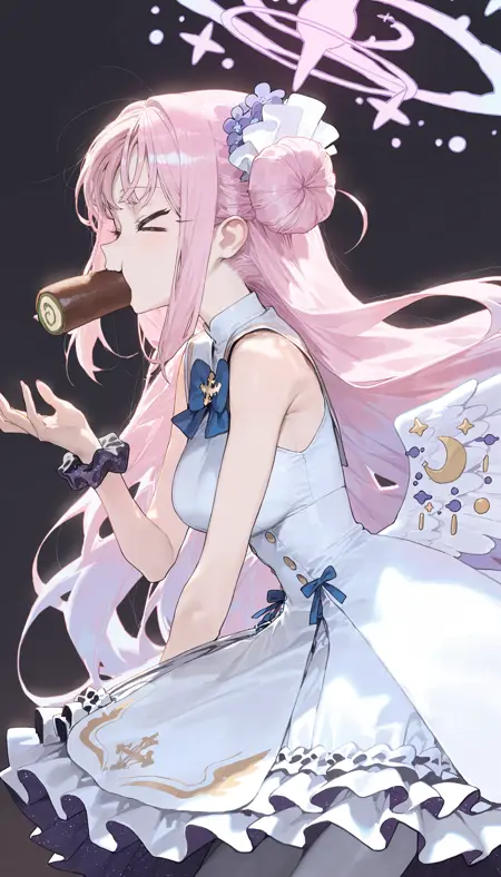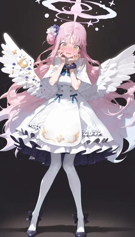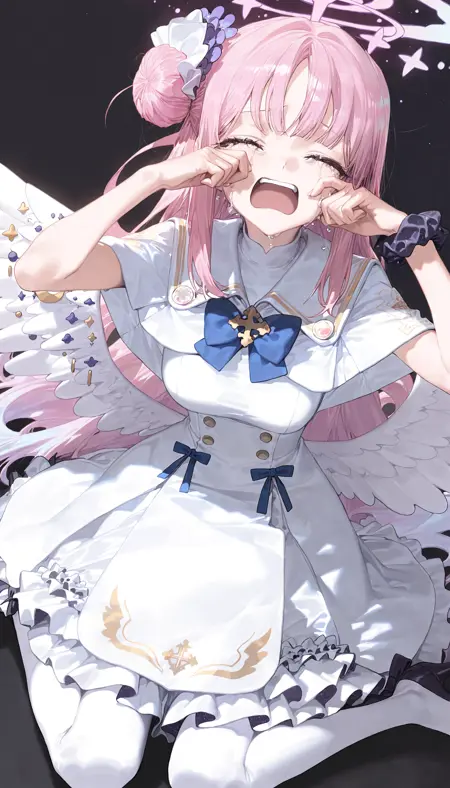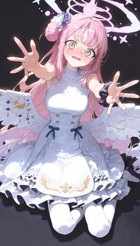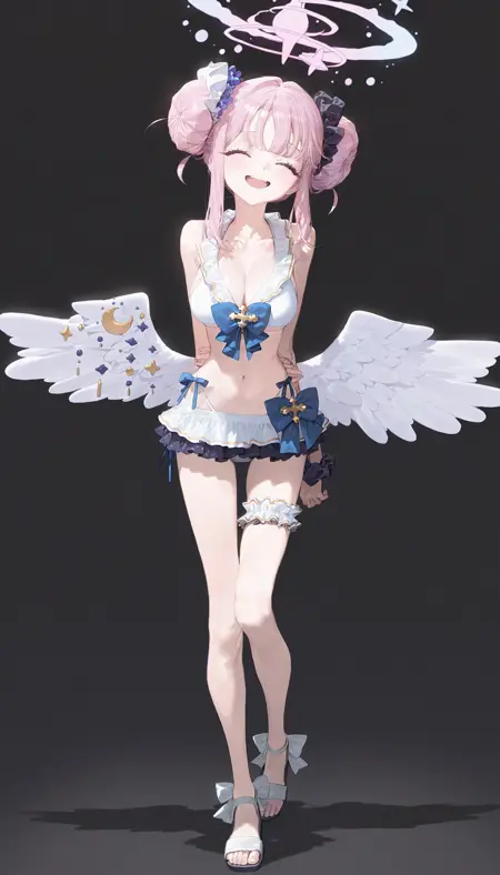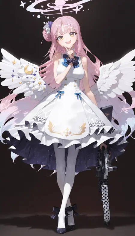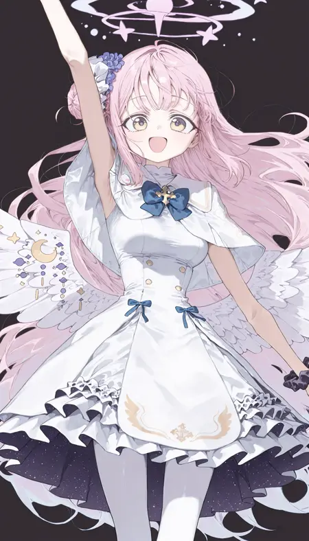 노란 눈, 분홍 머리카락, 한쪽 단발머리, 머리꽃, 미카 하늘색 고리, 그라데이션 머리, 파란 리본 넥타이, 미카 천사 날개, 낮은 날개,
