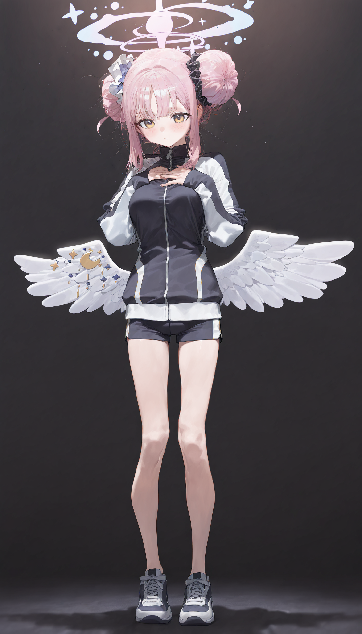 분홍 머리카락, 미카 하늘색 고리, 그라데이션 머리, 높은 토비스, 머리 스러니치, 미카 천사 날개, 낮은 날개,