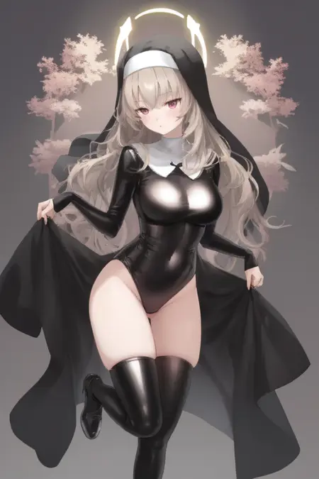 To prompt her nun dress enter "lora:Sakurako-BlueArchive-v2:strengthSakurako, nun dress, nun hood, thighhighs, halo," To prompt her latex outfit enter "lora:Sakurako-BlueArchive-v2:strengthSakurako, black latex outfit, black latex nun hood, black latex thighhighs, halo,"