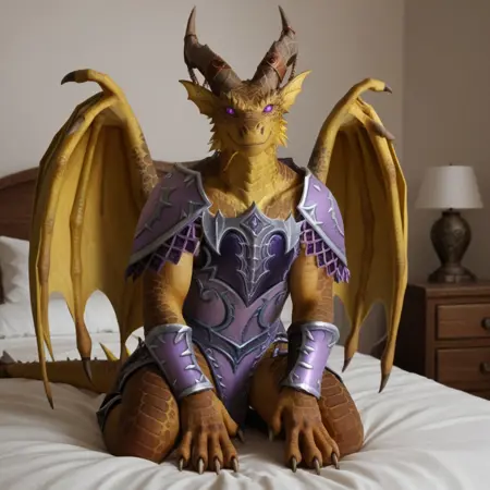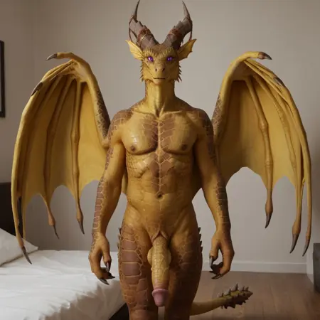 Additional prompts: dragon, dracthyr, yellow scales, wings, horns, head frills, tail, tail frills, neck frill, claws, male, 1boy, purple eyes
