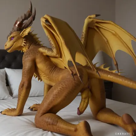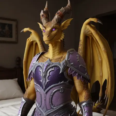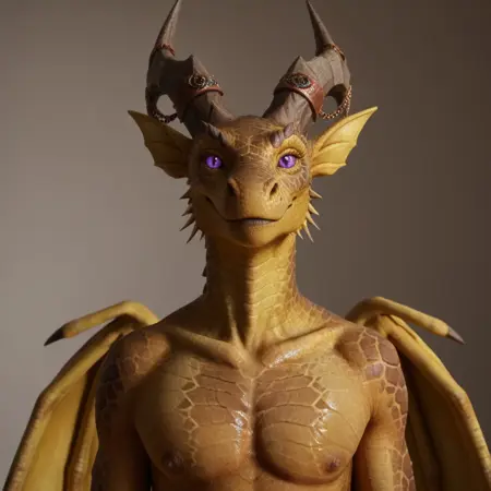 追加プロンプト:ドラゴン、ドラクスリ、黄色い鱗、翼、角、頭部のフリル、尾、尾のフリル、首のフリル、爪、男性、1boy、紫の目