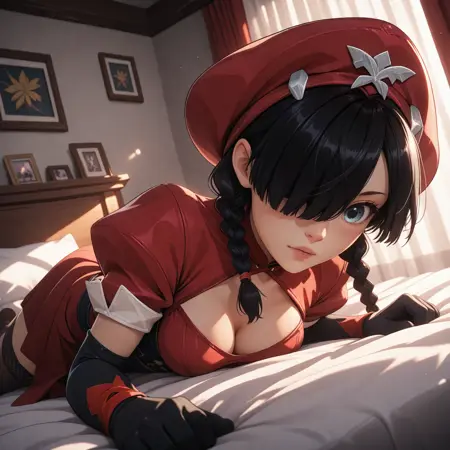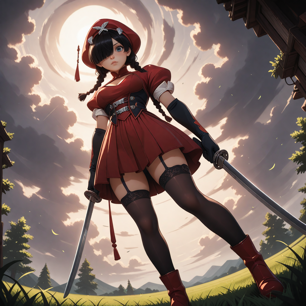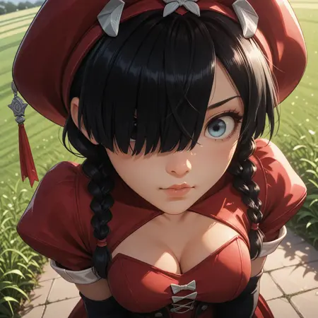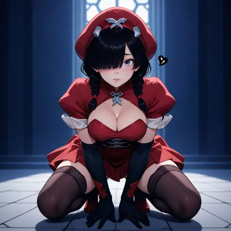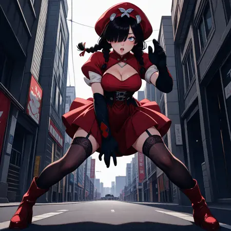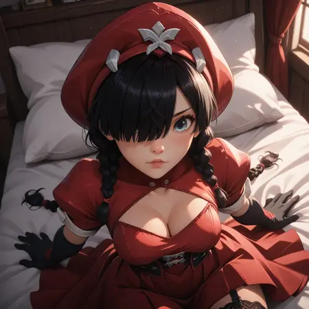 psyl0ck3bk, hat, gloves, black hair, black gloves, elbow gloves, red headwear, dress, thighhighs, red dress, braid, puffy sleeves, boots, hair over eyes, bangs, twin braids,