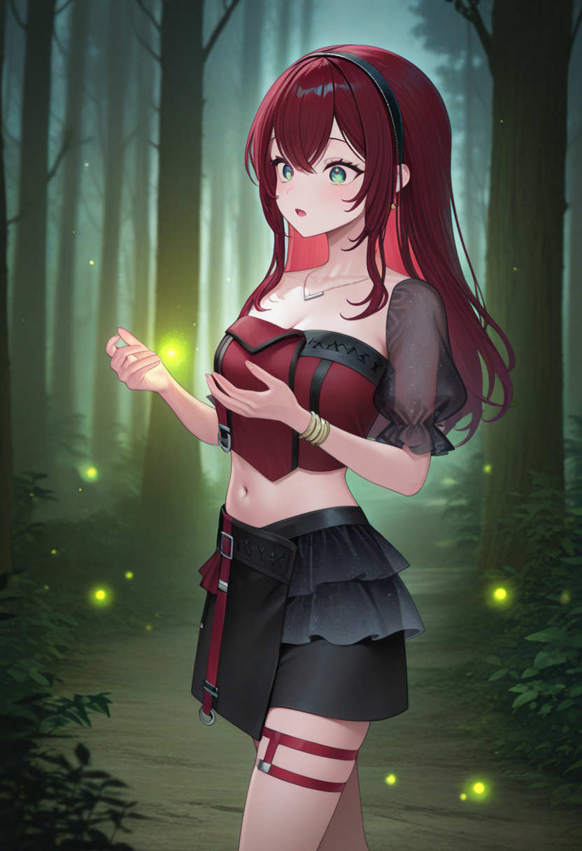 长发,红发,绿眼,锁骨,乳房,腹部,肚脐,黑色发带,发带,首饰,项链,上衣,乳沟,露脐装,透视袖子,短袖,蓬松袖子,手镯,透视,露脐,裙子,迷你裙,红上衣,黑裙,大腿绑带,及膝靴,靴子,黑色鞋履,交叉系带鞋履,系带靴