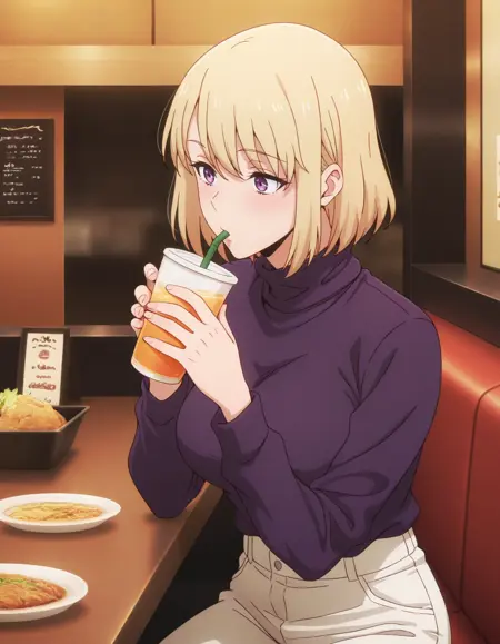 <lora:shizuku_kousaka-na_honjaman_level_up_s2-pxl-anime-soralz:1>, 코사카 시즈쿠 (na honjaman level up), 단발, 금발, 자주색 눈