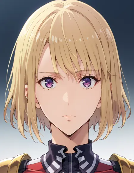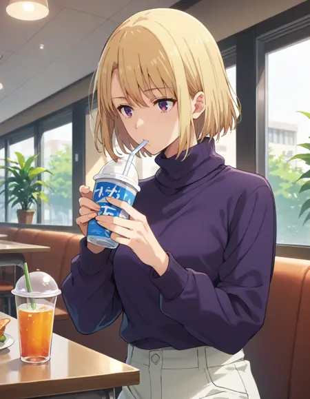 <lora:shizuku_kousaka-na_honjaman_level_up_s2-pxl-anime-soralz:1>, 코사카 시즈쿠 (na honjaman level up), 단발, 금발, 자주색 눈