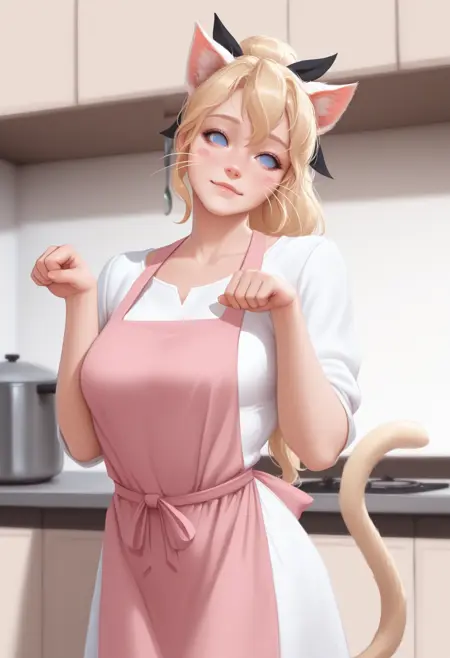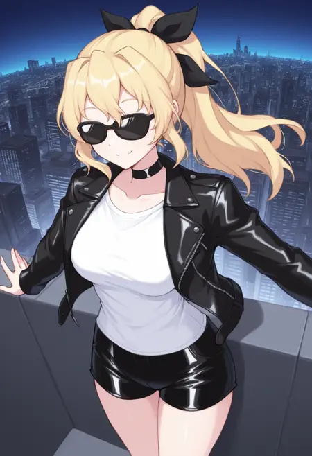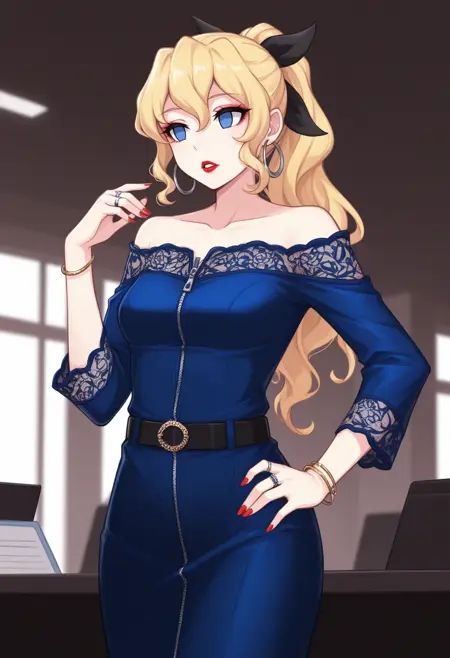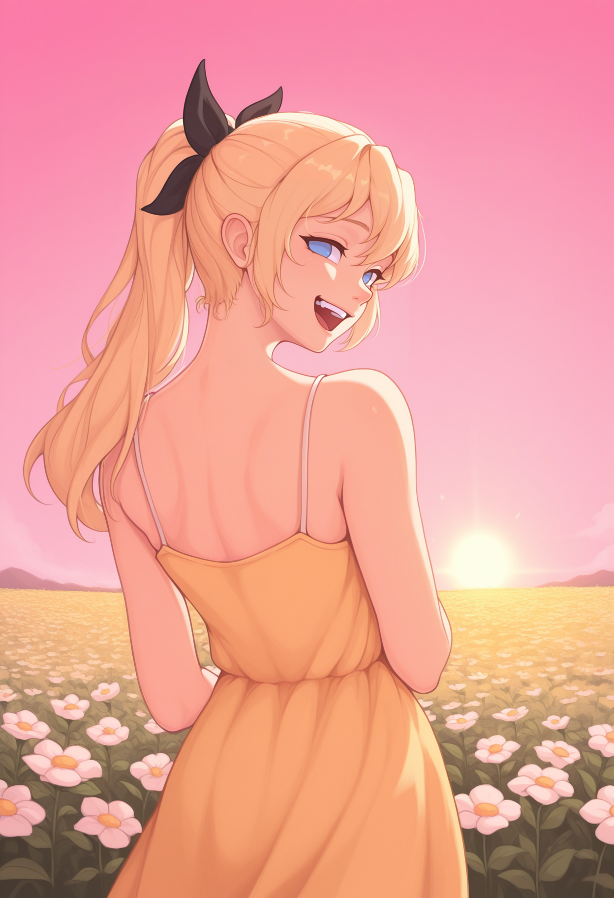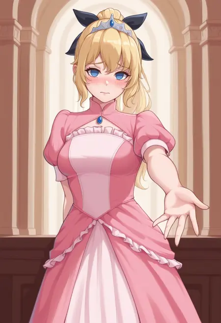 どんな衣装にも使えるメインプロンプト:NSLillyMisc、青い目、盲目、瞳孔なし、金髪、ロングヘア、ポニーテール、黒いリボン、髪飾りのリボン