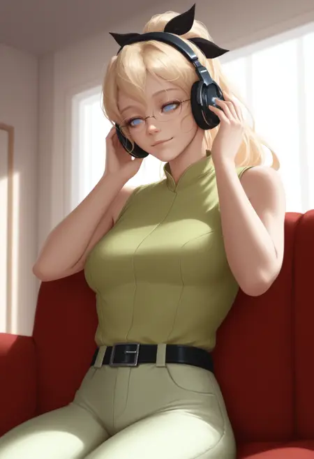 カジュアル装備はmiscに含まれている。こちらを使用する場合:NSLillyMisc、青い目、盲目、瞳孔なし、金髪、ロングヘア、ポニーテール、黒いリボン、髪飾りのリボン、カーキ色のセーター、片肩出しセーター、肩出し、黒い下着の肩紐、黄色のスカート、クロスネックレス