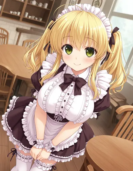 Hinano_Maid, maid, maid headdress, black bow, short sleeves, puffy sleeves, wrist cuffs, frills, frilled thighhighs