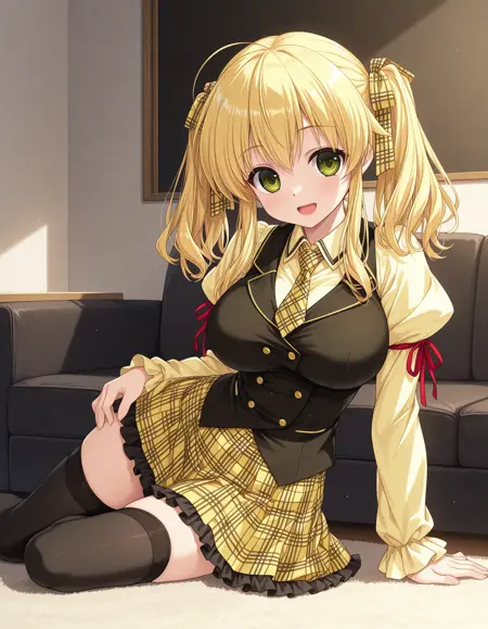 Hinano_OF1, black vest, yellow shirt, long sleeves, juliet sleeves, red ribbon on sleeves, plaid necktie, short necktie, miniskirt, yellow skirt, plaid skirt, black frilled skirt, black thighhighs