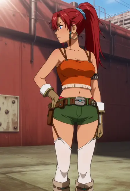 bellowscasu, 橙色短上衣, 露腹, 臂环, 手套, 红色内裤, 绿色短裤, 短裤下内裤, 棕色腰带, 斜挎包, 吊袜带, 白色过膝袜, 棕色鞋子,