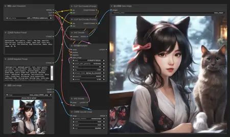 这是ComfyUI的配置文件,用于根据一张图片生成新的图片。版本1不带Lora模型,版本2带有两个Lora模型。注意:如果希望有较大变化,可以适当调整KSampler的cfg和denoise参数。