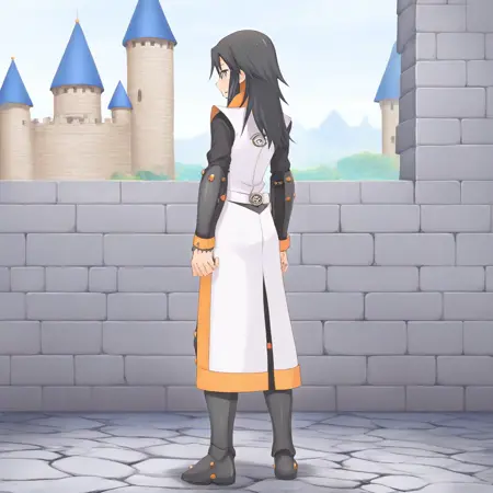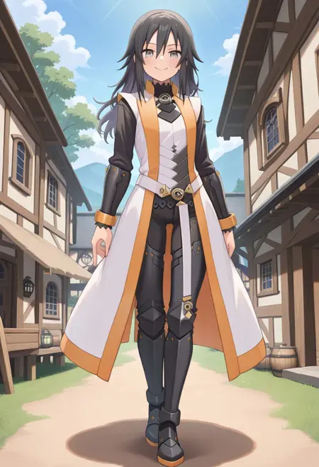 提示词: Azlier_SN,黑发,刘海,头发遮住眼睛,长发,鬓发,灰眼睛,白色外套,有领外套,无袖外套,敞开外套,护喉,黑色护喉,胸针,白衬衫,高领衬衫,黑色高领,黑色袖子,盔甲,腰带,护臂,黑色长裤,胫甲,金属靴,