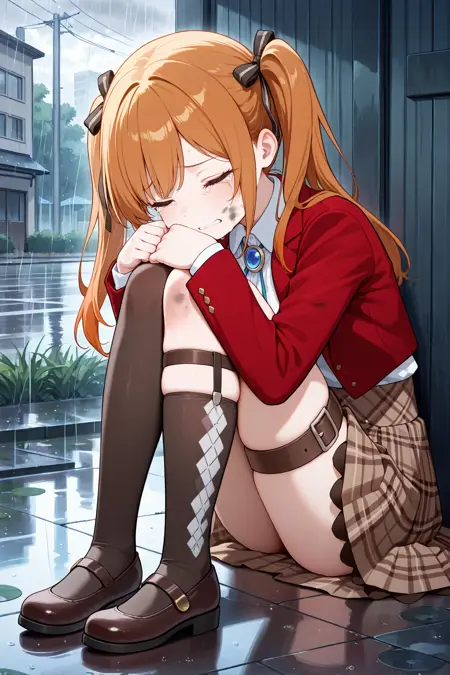 **Outfit:**bas30utfit,red beret,red jacket,white shirt,blue brooch,plaid skirt,asymmetrical legwear,uneven legwear,argyle legwear,thigh strap,brown mary janes,