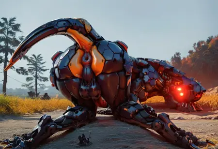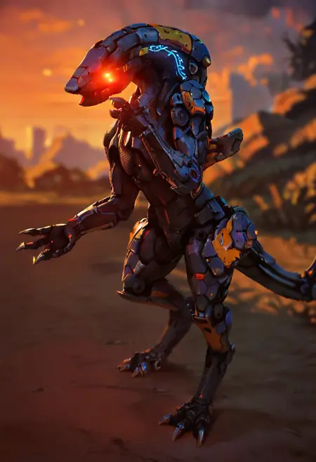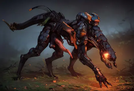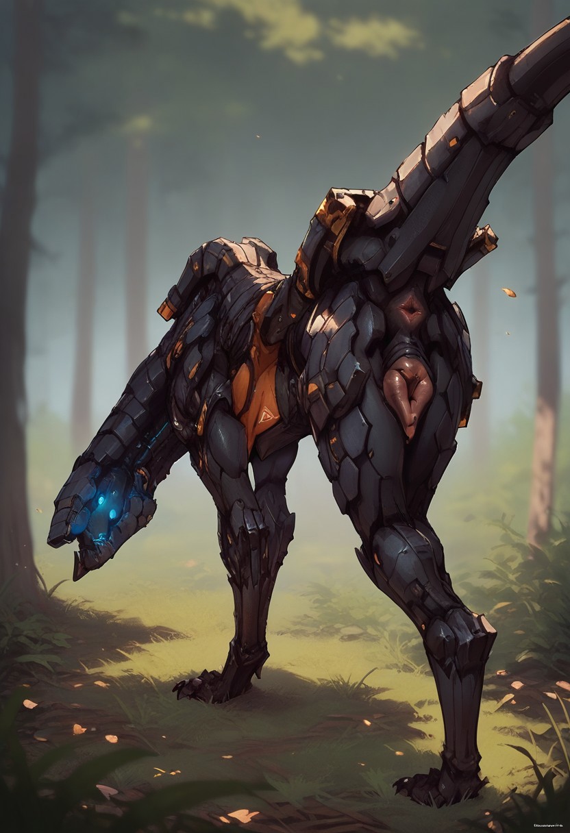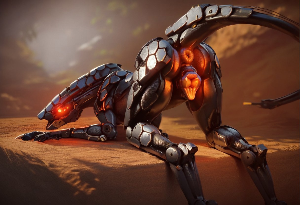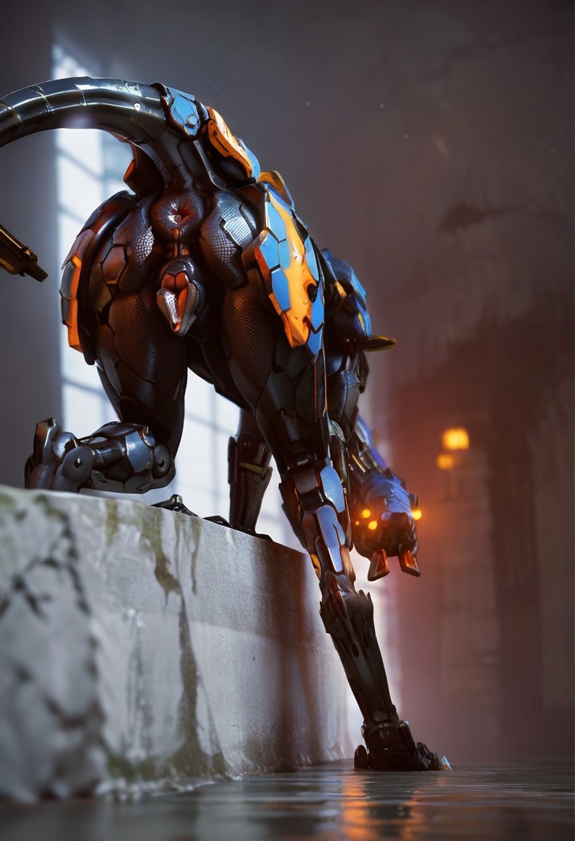 stalker, robot panther, black body, claws, glowing eyes, cat legs, long tail
