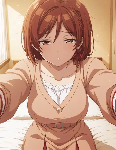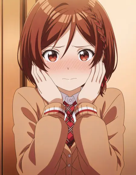 트리거: 갈색 눈, 아카네사크, 곡선형, 짧은 갈색 머리