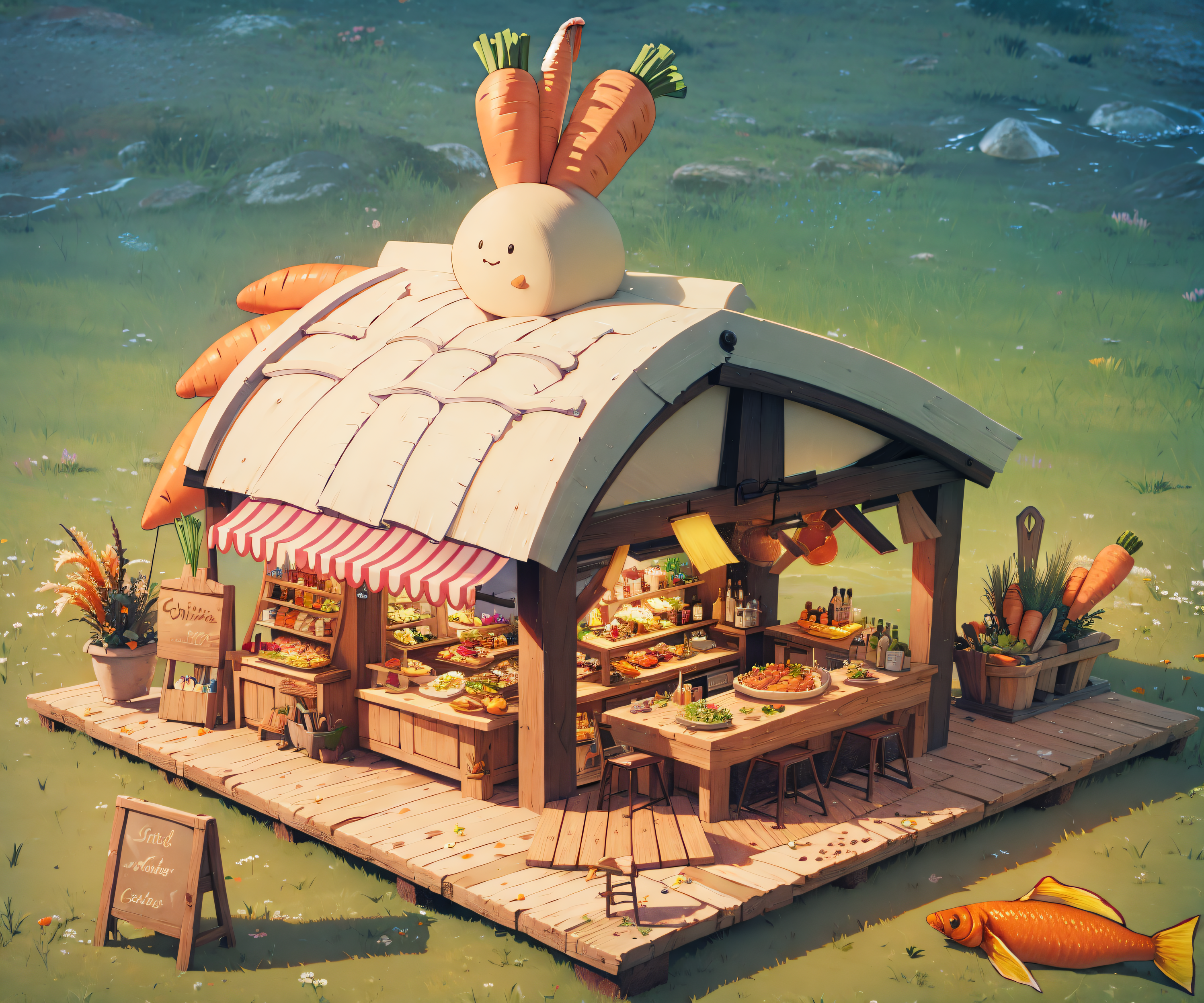 지붕 위에 큰 물체가 놓이거나 지붕의 일부가 되도록 시도했습니다. 이 LoRA의 모든 이미지가 지붕 위에 음식/디저트/동물이 있는 것으로 학습된 것은 아닙니다. 향후 다른 버전을 제작하겠습니다.