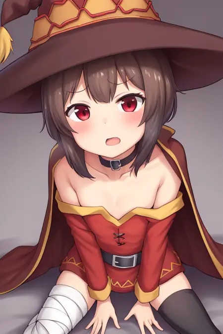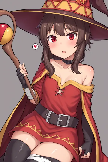프롬프트: Megumin-Liver020, 1girl, solo, short hair, brown hair, black hair, short hair with long locks, red eyes, red dress, short dress, witch hat, cape, black cape, brown cape, gloves, black gloves, fingerless gloves, thighhighs, black thighhighs, asymmetrical legwear, single thighhigh, boots, black belt, brown belt, belt buckle, choker, black choker, collar, bandages, bandaged leg, staff, holding staff, bare shoulders, long sleeves, collarbone, heart, spoken heart, cropped legs, mismatched legwear, brown footwear, orange footwear, black headwear, brown headwear, zettai ryouiki, off shoulder, off-shoulder dress
