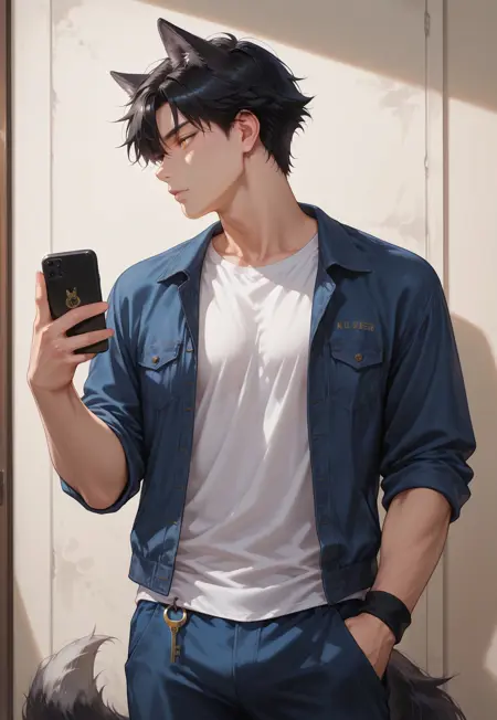 キーワード(一部旧版):Akeru, wolf boy, animal ears, wolf ears, wolf tail, amber eyes, black hair, animal ear fluff, bangs, white tail tip