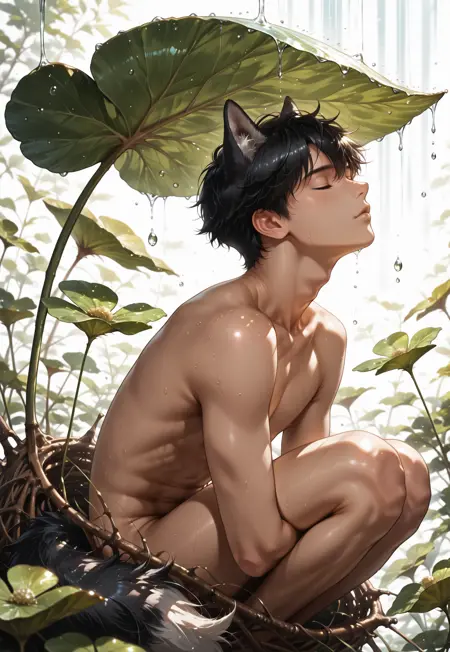 male focus, yaoi, twink, 1boy, 2boys, solo focus, nude, collar, glossy, kemonomimi, pet play, bondage, restrained