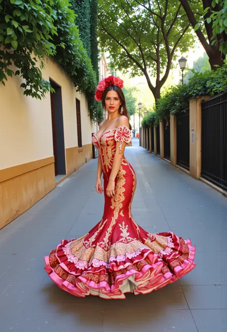 リアルistic、最高品質、lora:Flamenca_Style_Flux:1 fl4m3nca、ドレス、花、髪飾り、フリル、立ち姿、胸元、セビリア、細いウエスト、屋外、マニラのショール