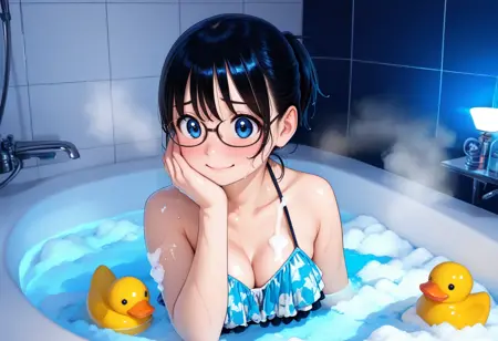 如果在提示词中加入“blue theme”、“purple theme”、“pink theme”或“glowing”等关键词,或许能激活浴缸LED灯的发光效果,使水面泛起辉光(随机效果)。