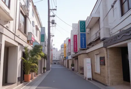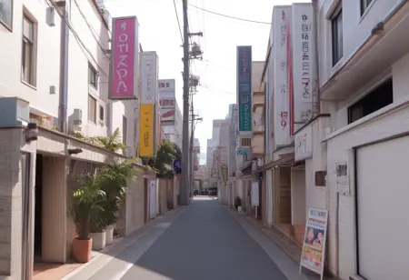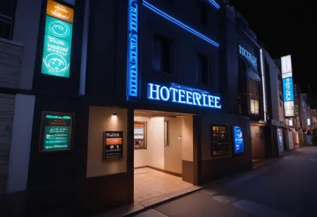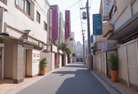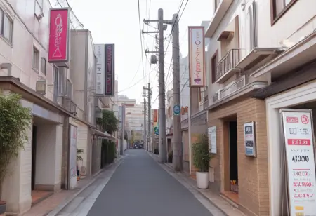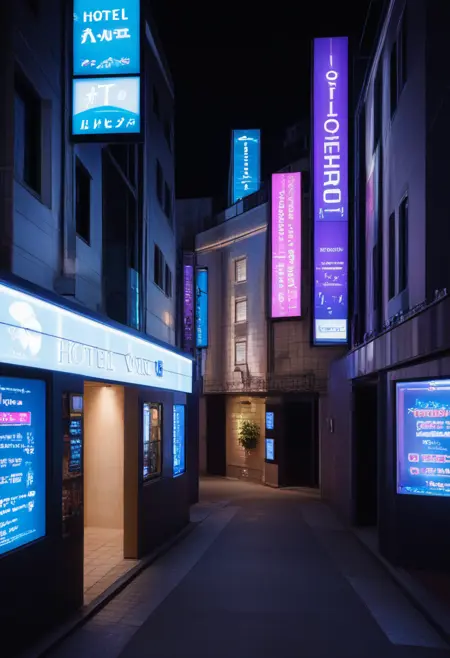 간판이나 도로에 면한 입구 근처에 있는 ‘휴식 30분, 숙박 1000엔, 서비스 타임 xx시간’ 같은 간판 등, 시간이 밤이라면 prompt에 ‘night, sign, neon sign, neon lights’ 등을 넣어 주시면 대략 그런 분위기를 연출할 수 있습니다. 낮 풍경도 그릴 수 있습니다.