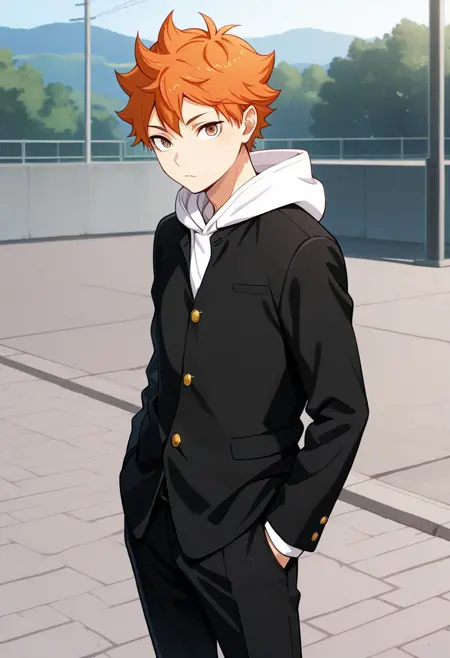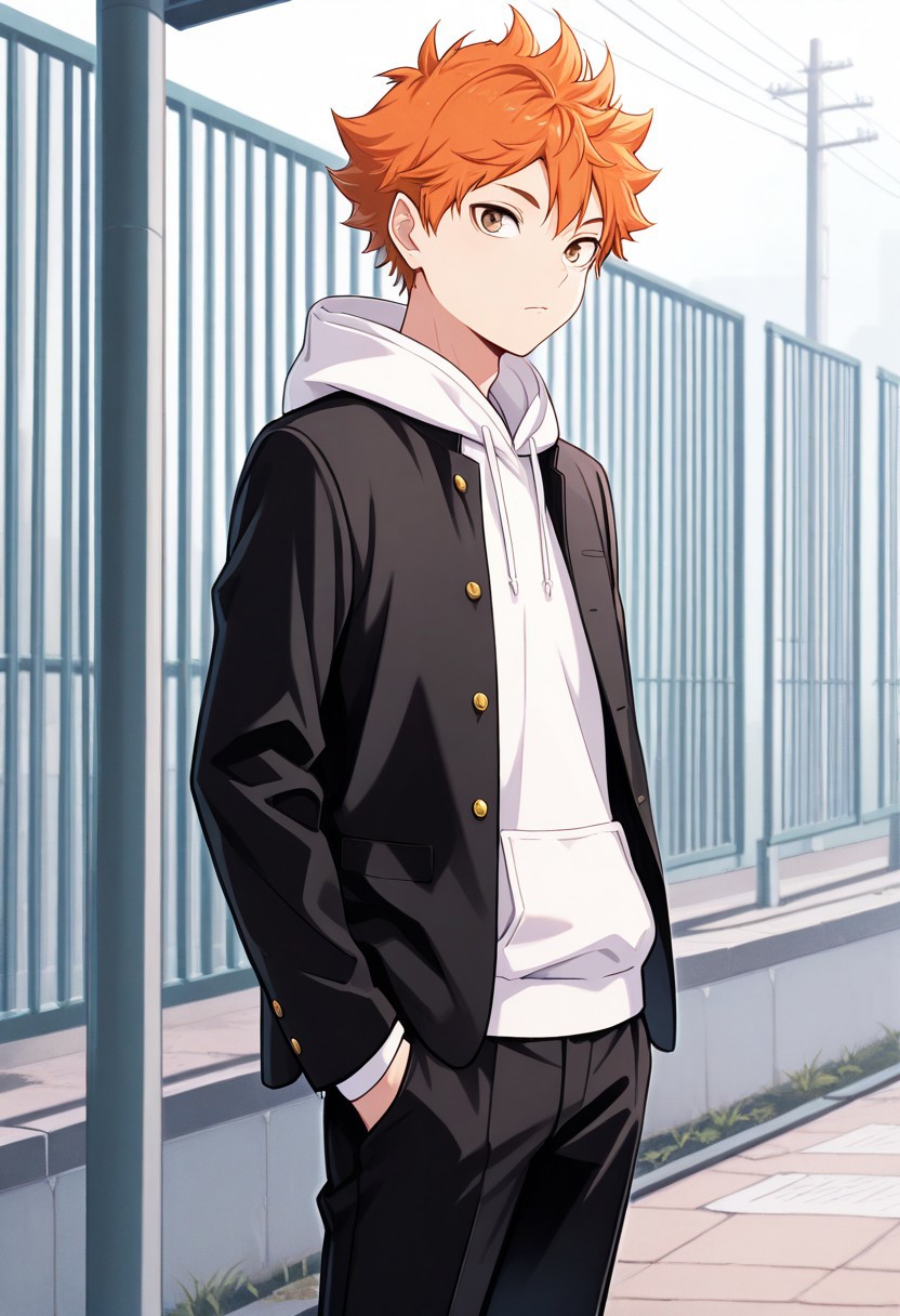 1boy, 男性焦点, 单人, 棕色眼睛, 橙色头发, 校服, 白色连帽衫, 帽兜, 学生制服, 黑色夹克, 黑色长裤,