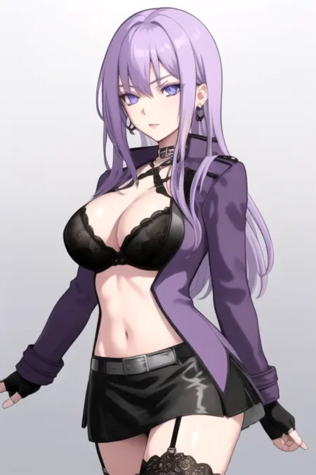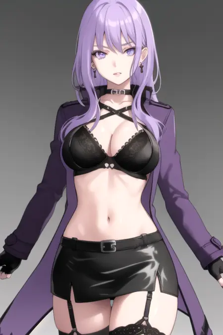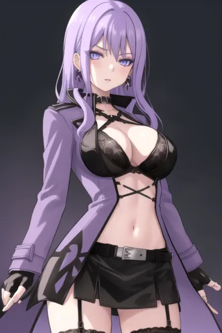 LisetteRegnier, 1girl, solo, long hair, blue eyes, large breasts, black thighhighs, fingerless gloves, black bra, black skirt, miniskirt, cleavage, jewelry, purple eyes, purple hair, earrings, purple coat, makeup, thigh strap, garter straps