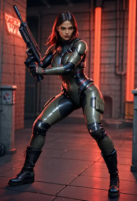 角色应为一位有魅力的女性,面部轮廓分明,身材丰满,棕色头发和眼睛,我已为其添加了深色妆容,但通过提示词可以很容易地修改。