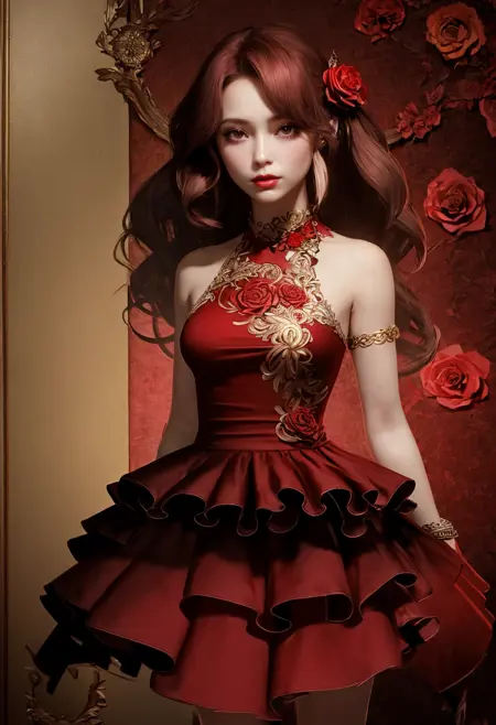 aiondreamstriderombre额外提示词: 红色连衣裙、红黑渐变、渐变效果、金色装饰、金色镶边、金色刺绣、黑色薄纱拖尾、黑色透明拖地薄纱