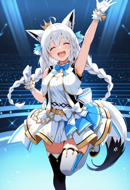 Idol Originfbk_idol, twin braids, hololive idol uniform, blue bowtie, sleeveless, layered skirt, white gloves, white thighhigh, black thighhigh, mini crown, fox tail