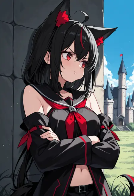Kurokami Fubuki (old)fbk_krkmi, red eyes, black hair, streaked hair, black blouse, detached sleeves, red neckerchief, short shorts, thigh strap, single thighhigh, black tail, red fluff