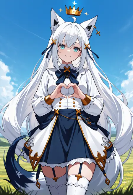 Saintfbk_saint, very long hair, floating crown, white corset, gold trim, blue skirt, white overskirt, blue bow, x hair ornament, white thighhighs, garter straps, long sleeves, fox tail