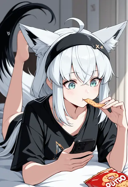 Loungewear (shirt)fbk_relax, sidelocks, black hairband, no pants, black t-shirt, fox tail